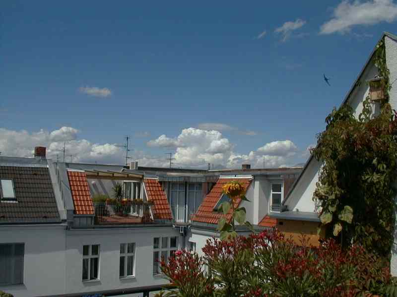 Bild 5: Es gab schon erste Auseinandersetzungen zwischen Spatzenvater und einem neugierigen und aufdringlichen Mauersegler. Bisher hat er sich gut behaupten können. Wünschen wir ihm, sich und seine Familie weiter tapfer zu verteidigen. Es ist ja noch für weitere 3 Vogelfamilien Platz. Er scheint sich wohl zufühlen. Stolz wie OSKAR schaut der Spatz aus seinem Einflugloch heraus. Die Mauersegler sind seit heute (27-05-2002) fliegerisch sehr aktiv. Sie ziehen in immer engeren Kreisen durch den Innenhof und stossen dabei ihre typischen Schreie aus. Fliegen muss den Flugkünstlern viel Spaß machen. Deshalb ist Fliegen auch meine Leidenschaft geworden. Als Segelflieger kann man sich ein wenig wie ein Vogel fühlenl. |