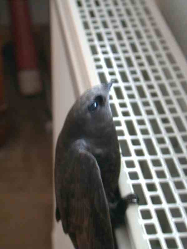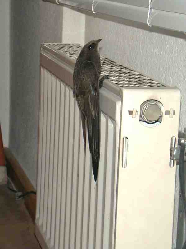 | Bild 10 : Reglos und erwartungsvoll sitzt dieser ausgewachsene Mauersegler auf dem Heizkörper. |