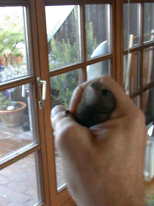 Bild 11: Wenn man bedenkt, daß er den weiten Weg von Afrika bis zu uns in den Norden Europas unbeschadet zurückgelegt hat, um sich hier in Berlin in einer Wohnung zu verirren, dann freut man sich, ihm wieder in die Luft zu verhelfen zu können. In der Aufregung sind einige Fotos nicht ganz scharf geworden. |