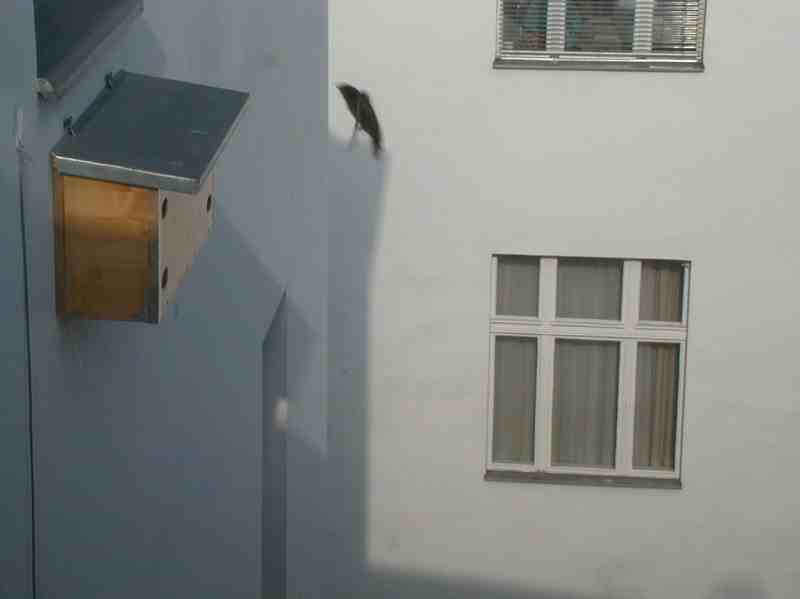 der Nähe des Nistkastens umher. Dann passierte es, bei meinen Beobachtungen sah ich, wie ein Mauersegler durch das offene Fenster ins Schlafzimmer flog und nicht wieder heraus kam. |