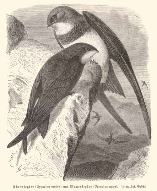 Der Mauer- oder Thurmsegler (Cypselus apus) ist es, welchen wir vom ersten Mai an bis zum August unter gellendem Geschrei durch die Straßen unserer Städte jagen oder die Spitzen alter Kirchthürme umfliegen sehen. Der Vogel ist weit verbreitet ... --------------------- Über die höheren Fähigkeiten des Mauerseglers ist wenig günstiges zu sagen. Unter den Sinnen steht das große Auge unzweifelhaft obenan; auch das Gehör kann vielleicht noch als entwickelt betrachtet werden; die übrigen Sinne scheinen stumpf zu sein. Das geistige Wesen stellt den Vogel tief. Er ist ein herrschsüchtiger, zänkischer stürmischer und übermüthiger Gesell, welcher streng genommen mit keinem Geschöpfe, nicht einmal mit seinesgleichen, in Frieden lebt und unter Umständen anderen Thieren ohne Grund beschwerlich fällt. Um die Nistplätze zanken sich die Mauersegler unter lautem Geschrei oft tagelang. Aus Eifersucht packen sich zwei Männchen wüthend in der Luft, verkrallen sich fest in einander und wirbeln nun von oben bis zum Boden herab. Ihre Wuth ist aber so groß, daß sie hier häufig noch fortkämpfen und sich mit Händen greifen lassen. Meinem Vater wurden Mauersegler gebracht, welche todt aus der Luft herab gefallen waren. Bei der Untersuchung zeigte sich, daß ihnen während der nebenbuhlerischen Kämpfe die Brust vollständig zerfleischt worden war. ... --------------------- Wir kennen keinen deutschen Vogel, welcher ihn im Fluge überträfe. Dieser kennzeichnet sich durch ebenso viel Kraft und Gewandtheit wie durch geradezu unermüdliche Ausdauer. Der Mauersegler versteht zwar nicht die zierlichen und raschen Schwenkungen der Schwalben nachzuahmen, aber er jagt dafür mit unübertrefflicher Schnelligkeit durch die Luft. Seine schmalen, sichelartigen Flügel werden zeitweilig mit so großer Kraft und Hurtigkeit bewegt, daß man nur ein undeutliches Bild von ihnen gewinnt. Dann aber breitet der Vogel dieselben plötzlich weit aus und schwimmt und schwebt nun ohne jegliche sichtbare Flügelbewegung prächtig dahin. Der Flug ist so wundervoll, daß man alle uns unangenehm erscheinenden Eigenschaften des Seglers darüber vergißt und immer und immer wieder mit Entzücken diesem schnellsten Flieger unseres Vaterlandes nachsieht. ... Die kompletten Texte - in Frakturschrift - habe ich eingescannt und abgespeichert. Es sind faszinierende Berichte, die sich auch heute noch lohnen gelesen zu werden. Es ist erstaunlich, wie genau die Menschen im 19. Jahrhundert beobachtet haben - ganz ohne technische Apparaturen - nur mit dem Feldstecher bewaffnet. Wer sich an den spannenden Augenzeugenberichten und Beobachtungen von vor 140 Jahren erfreuen möchte, findet sie hier: Mauersegler bei Brehms Thierleben von 1882 (PDF 1.36 MB) Der Faksimileabdruck über das Kapitel über die Mauersegler in Brehms Tierleben von 1882: |