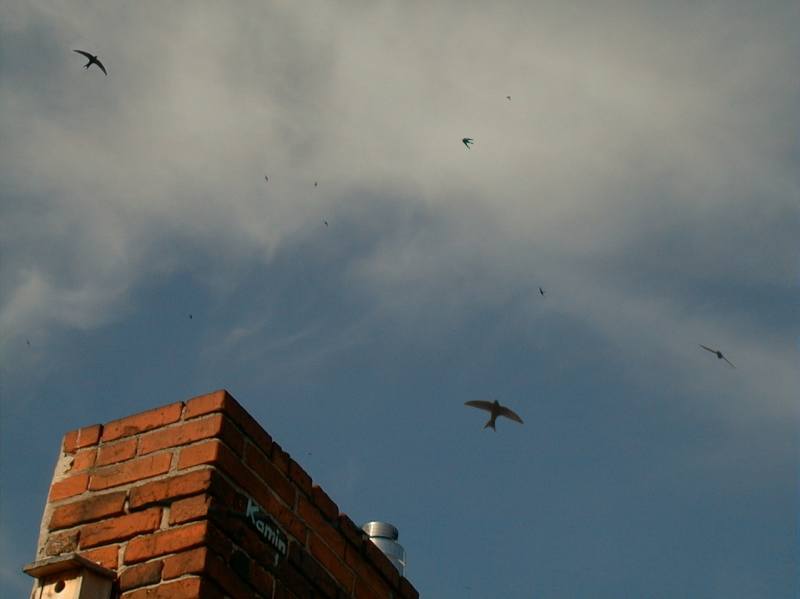 Seit Anfang Mai steigen sie zunehmend herab und verschwinden in schnellem Flug hinter den Dächern. Jetzt zeigen sie, was sie drauf haben. Unglaublich schnell kurvt ein Paar im Abstand von wenigen Zentimetern hinter einander her, trennt sich und verschwindet so schnell, wie es zuvor aufgetaucht war. Die sich über den ganzen Tag hinziehenden imposanten Flugvorführungen (Balzflüge von einzelnen männlichen Mauerseglern) machen bestimmt großen Eindruck auf das andere Geschlecht! |