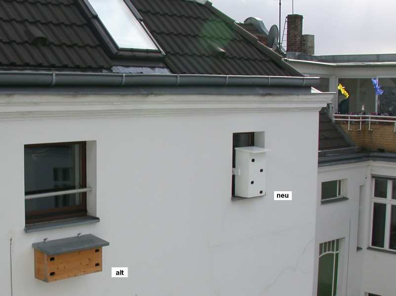 ... Diesmal sind die Spatzenjungen schon dem Nest entwachsen und groß genug, um nicht wieder von den Seglern verdrängt zu werden. Die Segler haben jetzt 8 Bruthöhlen. Hoffentlich spricht sich das bald in Seglerkreisen rum! |