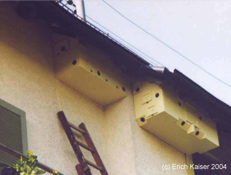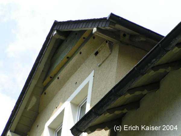 Seine Mauerseglekolonie in Kronberg i.Taunus ist mittlerweile auf 45 Brutplätze angewachsen. Giebelansicht von außen |