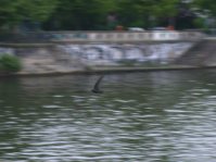immer mehr eintreffen. tief fliegender Mauersegler über der Spree bei leichtem Regen, am 8. Mai 2004 |