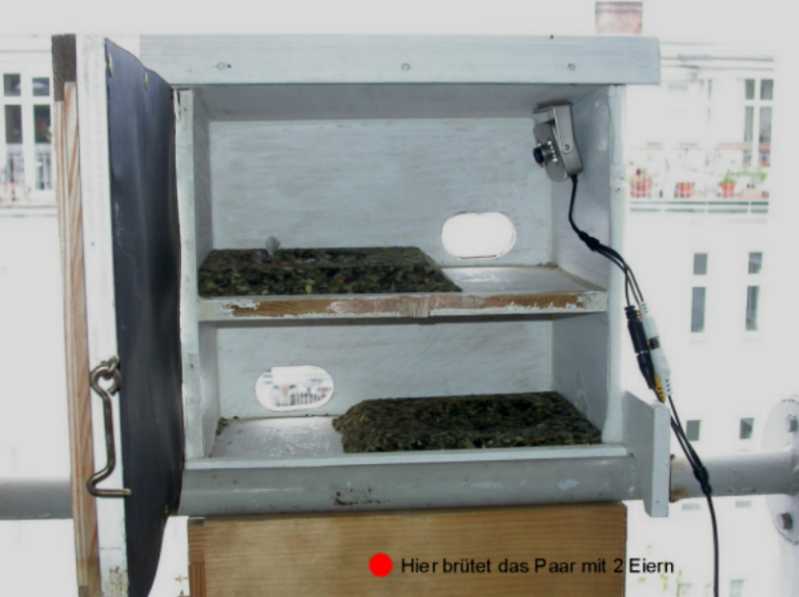 noch leeren Brutplätzen in der oberen Hälfte; die Nistkastenkamera, befindet sich oben rechts |
