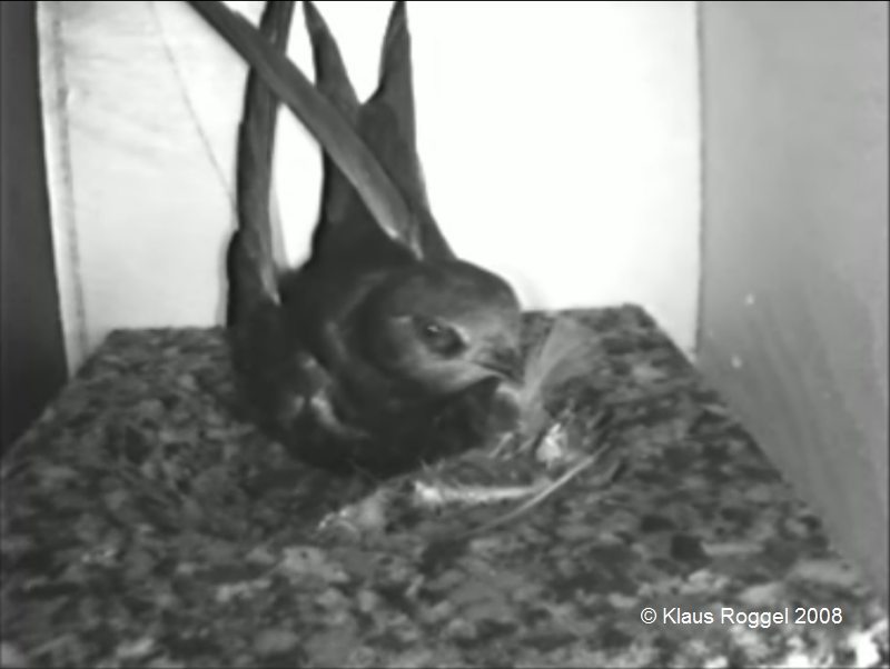 Segler in der Nistbox (2). Er putzt sich und treibt Fitness. |
