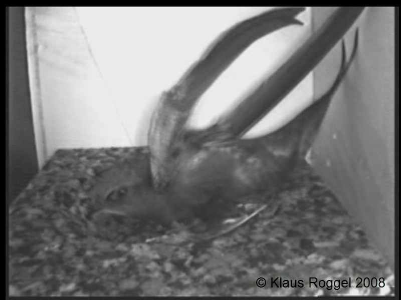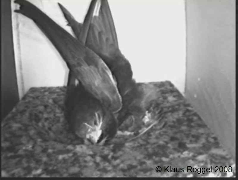 gelang, und schließlich hat er ihn ausgespien. Bei Altseglern ist der Schlund nicht mehr so dehnbar wie bei Nestlingen, Ich konnte dieses Verhalten gelegentlich sogar in besetzten Boxen beobachten, wenn in meinen großen Boxen die Nestlinge bei großer Hitze irgendwo satt in einer Ecke saßen und nicht bettelten. Nachdem er minutenlang vergeblich versucht hatte, das leere Nest zu füttern, erfolgte dann das beschriebene Verhalten. Erich Kaiser, 7. Juli 2008 |