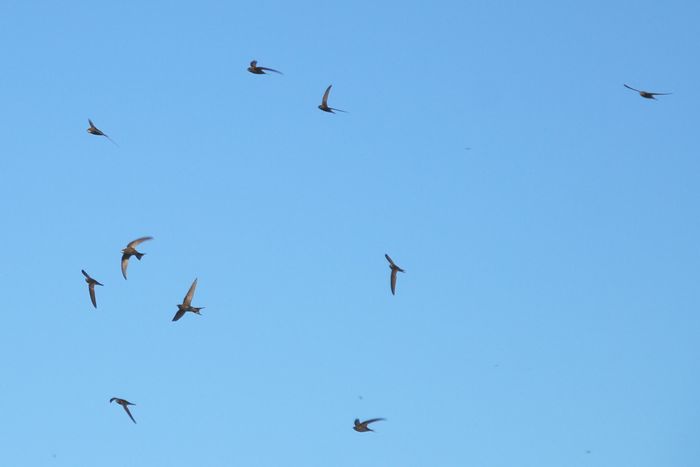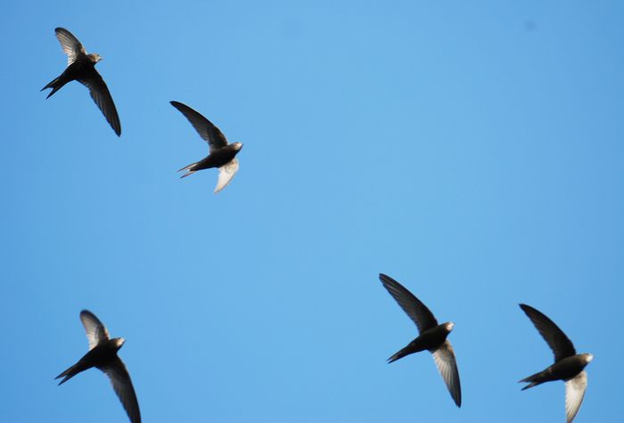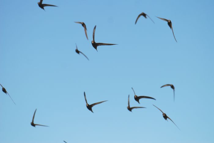 Bei gutem Wetter herrscht turbulenter Flugbetrieb - alle Nichtbrüter fliegen in größeren Gruppen und schießen rasant um die Häuser und Dacher. Dabei schreien sie vor lauter Freude ihr lautes Sriii-sriii. |