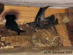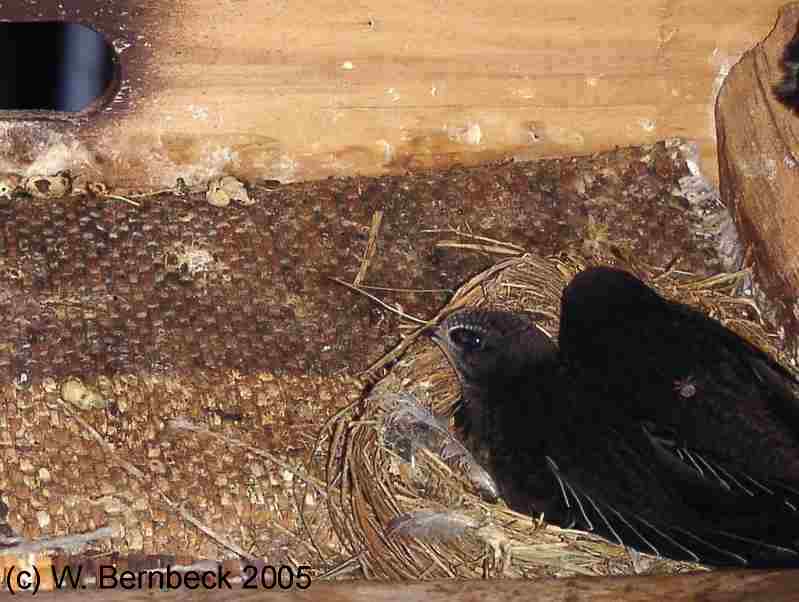 Herr Roggel, Wir haben bereits im Herbst 2004 2 mal miteinander telefoniert. Hiermit möchte ich Ihnen einige Bilder aus einem von den beiden Mauerseglernestern an unserem Haus schicken. Das vom Dachboden aus bequem einsehbare Nest liegt in ca. 10 m Haushöhe hinter einem Ortbrett unter der Dachrinne, mit Hartfaserplatte ca. 90 x 90 cm abgeschirmt, Beobachtungsschlitz ca. 80 x 15 cm. Von mir eingearbeitete Einflugöffnung: Langloch 32 x 65 mm, waagrechte Bodenfläche ca. 30 x 40 cm. Nestmulde: von mir eingelegter flacher Knoten, aus langem dürrem Gras gebildet. Die Aufnahmen wurden von meinem Vereinskameraden Karl-Heinz Zobich gemacht. Er ist inzwischen zum NABU-Vorsitzenden im Vogelsbergkreis gewählt worden. Dieser Nistplatz ist bereits seit 1988 besetzt! Dieses Mal hatten wir in diesem Nest 3 Jungsegler, wenige Tage vor dem erfolgreichen Ausflug. (Jungtiere sind seit 1989 mit einer Ausnahme immer erfolgreich ausgeflogen) Man kann beim Vergrößern viele interessante Details erkennen: - Flatterübungen zur Kräftigung der Flugmuskulatur, - die hellen Federsäume, - der größere helle Kehlfleck, - die winzigen Nasenlöcher auf dem Schnabel, - eine Seglerblutlausfliege auf dem Rückengefieder. |